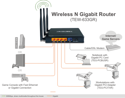 The 300Mbps Wireless N Gigabit Gaming Router incorporates the latest wireless and Gigabit networking technology to increase speed, range, security and reliability. The router provides unsurpassed gaming and network experience and performance.