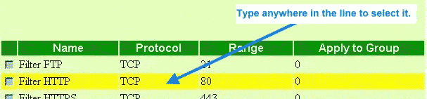 This screen enables you to allow and deny access based upon a communications protocol list you create. The protocol filter profiles are listed in the table at the bottom of the page. Note: When selecting items in the table at the bottom, click anywhere in the item. The line is selected, and the fields automatically load the item's parameters, which you can edit: Protocol Filter: Enables you to allow or deny Internet access to users based upon the communications protocol of the origin. Click the radio button next to Disabled to disable the protocol filter.
