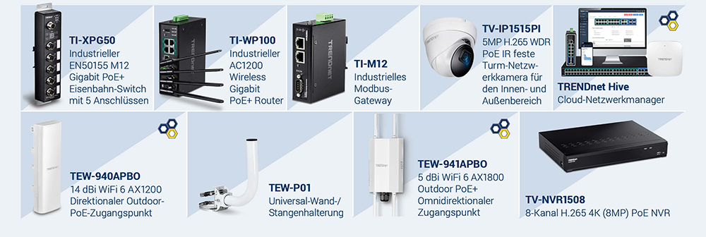 Mit den Netzwerklösungen von TRENDnet, darunter industrielle Switches, Glasfaser-Medienkonverter, SFP-Module, Modbus-Gateways, Wireless Access Points für den Außenbereich und Power-over-Ethernet-Überwachungskameras (PoE), lassen sich stark frequentierte städtische Umgebungen problemlos überwachen und steuern. Die Netzwerkgeräte von TRENDnet ermöglicht die Kommunikation mit anderen wichtigen Teilen des intelligenten Verkehrssystems sowie mit dem mehrere Kilometer entfernten Hauptknotenpunkt. Diese Einrichtung unterstützt auch die V2X-Kommunikation und ermöglicht den Echtzeit-Datenaustausch zwischen Fahrzeugen, straßenseitiger Infrastruktur und zentralen Systemen.
