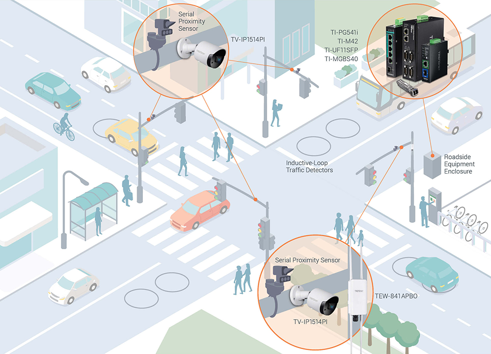 Serial devices, such as proximity sensors and traffic loop detectors, are networked through a rugged Industrial Modbus Gateway and a Hardened Industrial Gigabit PoE+ Managed DIN-Rail Switch, both found inside the roadside equipment enclosure to protect them from the weather. The connected serial devices support the use of real-time traffic information, allowing for changes in traffic lights and signals to keep both vehicle and car traffic moving and safe. The industrial managed switch is also supported by TRENDnet Hive™, a cloud network manager, that allows for remote management of the switch, helping to reduce overall maintenance and troubleshooting costs.