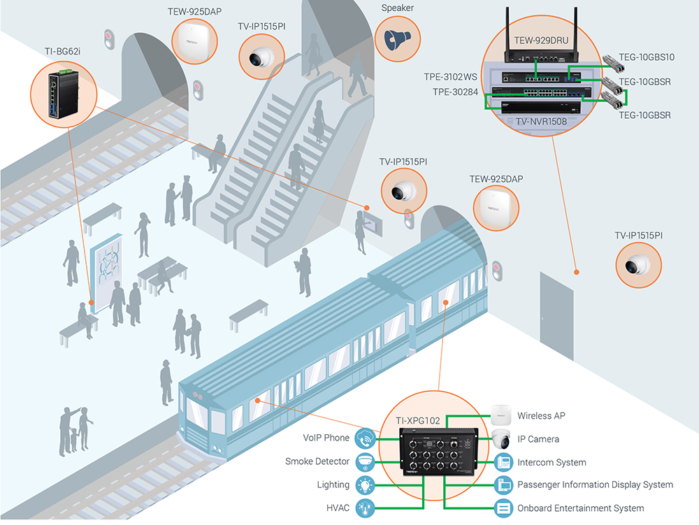 Throughout the public train station, there are several networked devices with varying purposes. PoE cameras are strategically placed throughout to provide general surveillance. Wireless APs serve a dual purpose; one for wireless devices installed throughout the station, such as public address systems (loud speakers), body-worn cameras by law enforcement officers and security staff, environmental sensors, and electronic devices used by staff; and the other is to provide public wireless hotspots for commuters and patrons.