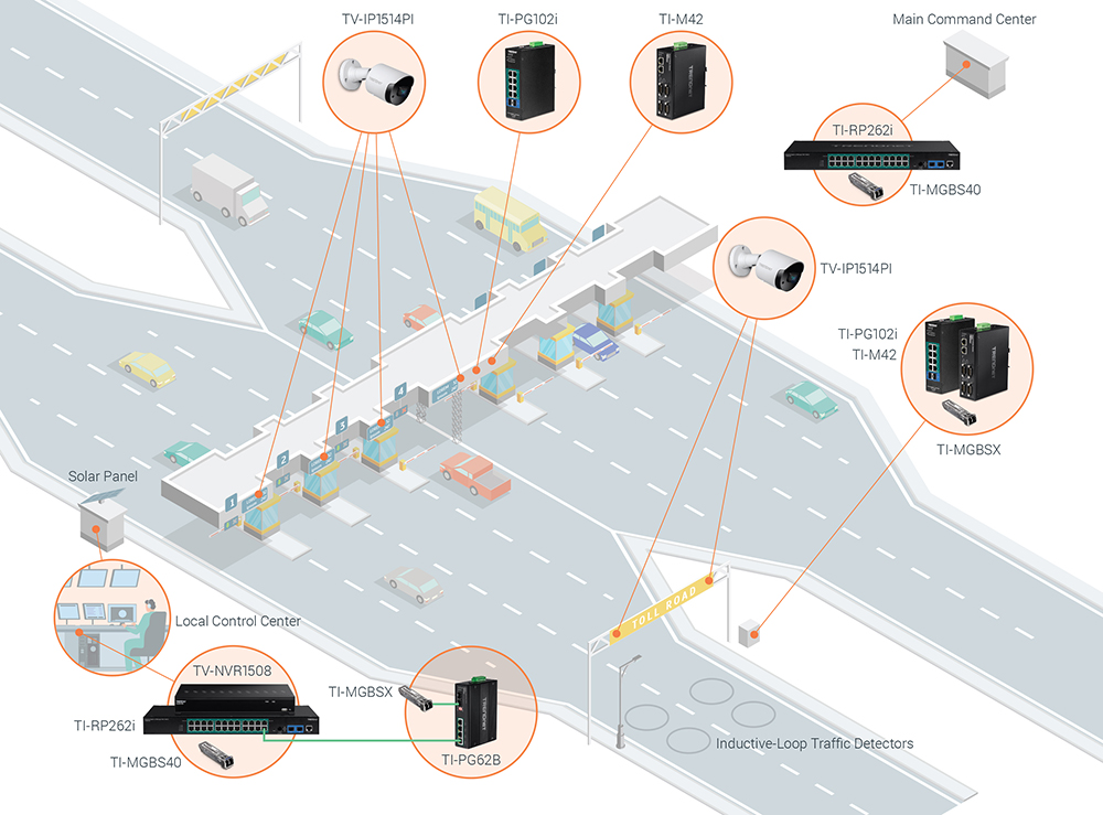 The Indoor/Outdoor PoE IR Bullet Network Cameras are also used with signage ahead of the tollbooth plaza for both surveillance and analytics. The Industrial Modbus Gateways connect both the Inductive-Loop Traffic Detectors and the Variable Message Signs (VMS) to the local network. Similar to the tollbooths, the Industrial Gigabit L2 Managed PoE+ DIN-Rail Switch networks devices located near the VMS to the Local Control Center via the Industrial SFP Multi-Mode Module.