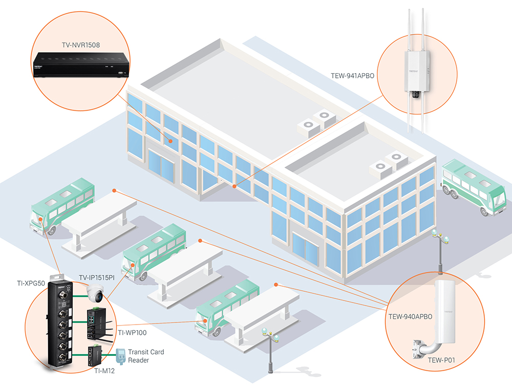 Network and manage key traffic data from municipal transit buses back to the central transit depot. Networking ITS equipment allows for immediate action with the use of real-time data. TRENDnet networking solutions include roadside units (RSU) and onboard units (OBU). In this application, RSUs include outdoor wireless access points and a network video recorder (NVR); OBUs include switches, routers, Modbus gateways, cameras, and transit card readers.