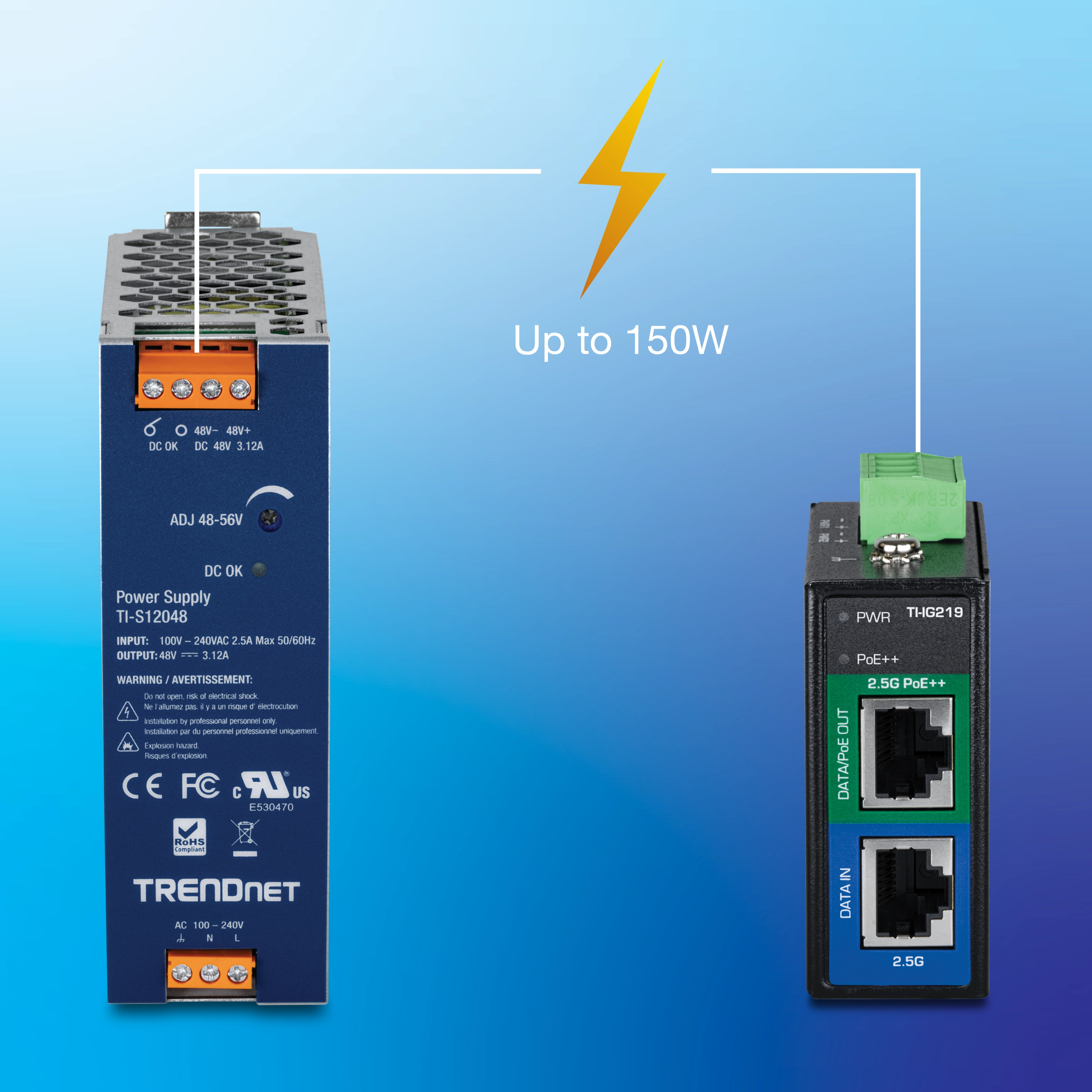 Fornisce fino a 150W (48V DC, 3,12A) di potenza per dispositivi di rete come switch industriali, iniettori ed estensori.