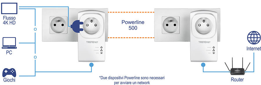 ** 500 Mbps è la velocità teorica massima di trasferimento dati di Powerline. Il rendimento effettivo varierà in funzione dell'ambiente. I dispositivi connessi in rete a Powerline devono essere collegati a prese a parete appartenenti allo stesso impianto elettrico. Le prese GFCI e i sezionatori AFCI possono degradare i segnali di rete di Powerline.