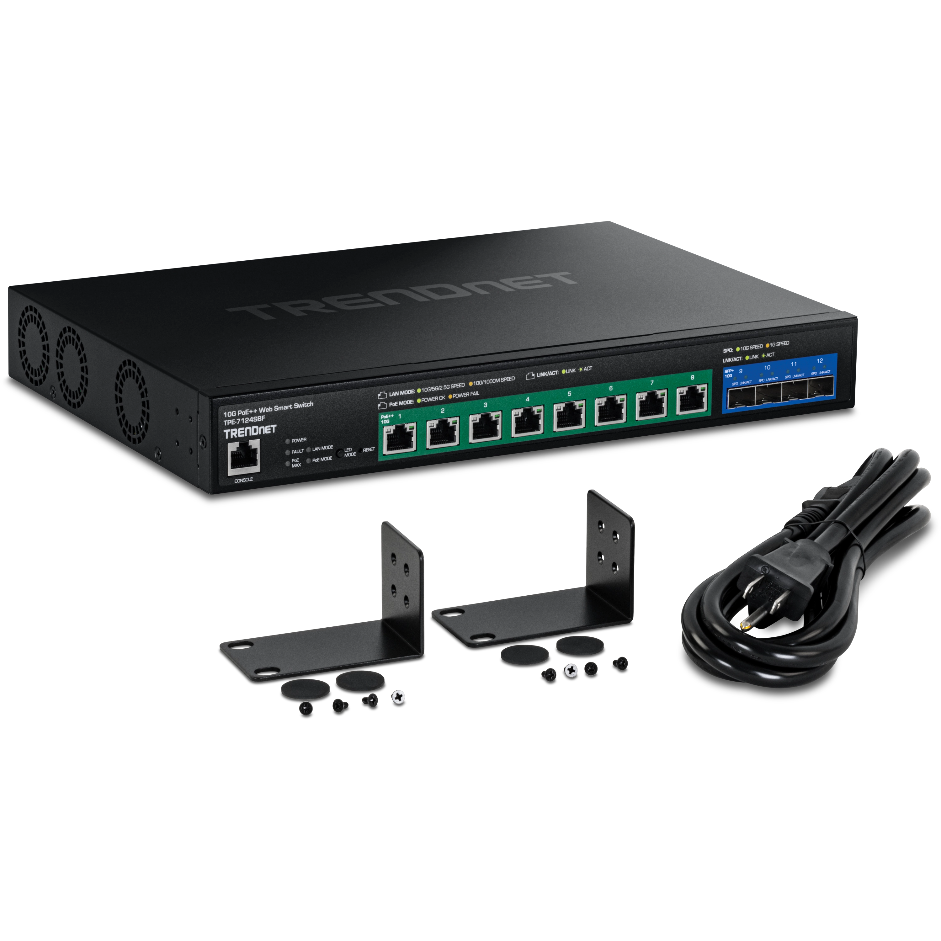 Este switch PoE++ 10G administrado de 12 puertos también cuenta con ocho puertos Ethernet PoE++ 10GBASE-T y cuatro puertos SFP+ 10G de fibra para conexiones de red de alta velocidad y larga distancia, lo que aporta una solución rentable para agregar capacidad de enlace 10G a las redes de las PYMES. Los instaladores e integradores pueden ahorrar gastos de equipo y reducir el tiempo de instalación con el switch PoE++ 10G de TRENDnet, suministrando 90W por puerto de alimentación PoE y datos a través de los cables Ethernet existentes. Conecte fácilmente en red dispositivos PoE con una potencia PoE total disponible de 720W a dispositivos como puntos de acceso wireless de alta potencia, iluminación LED, señalización digital, decodificadores IPTV, controles de acceso, cámaras y más con este switch PoE++ 10G administrado de alta potencia.