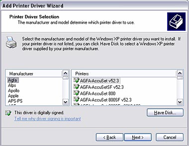 If you cannot find your printer from the list, click on the Have Disk button and browse to the printer drivers for your printer (floppy, CD, or downloaded)