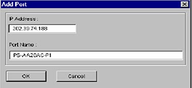 In the top field type in the IP address of your print server. In the bottom field type in the port name of your print server, the Port Name is the PS-xxxxxx-P1, x being the actual number listed in the Port Name box. Click on OK.