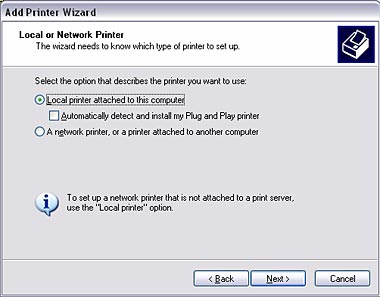 Step 2 Select Local Printer. Make sure to uncheck Automatically detect and install my plug and play printer. Click Next.