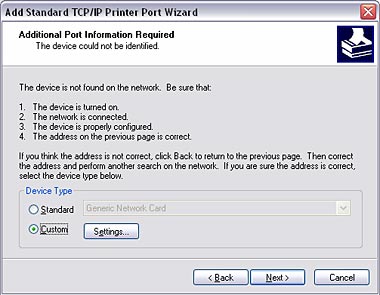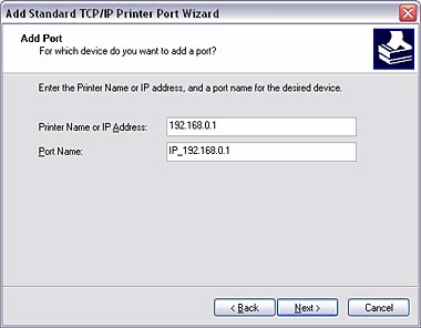 Step 4 Enter the IP address of the print server (192.168.0.1). Leave the port name with the default name. Click Next.
