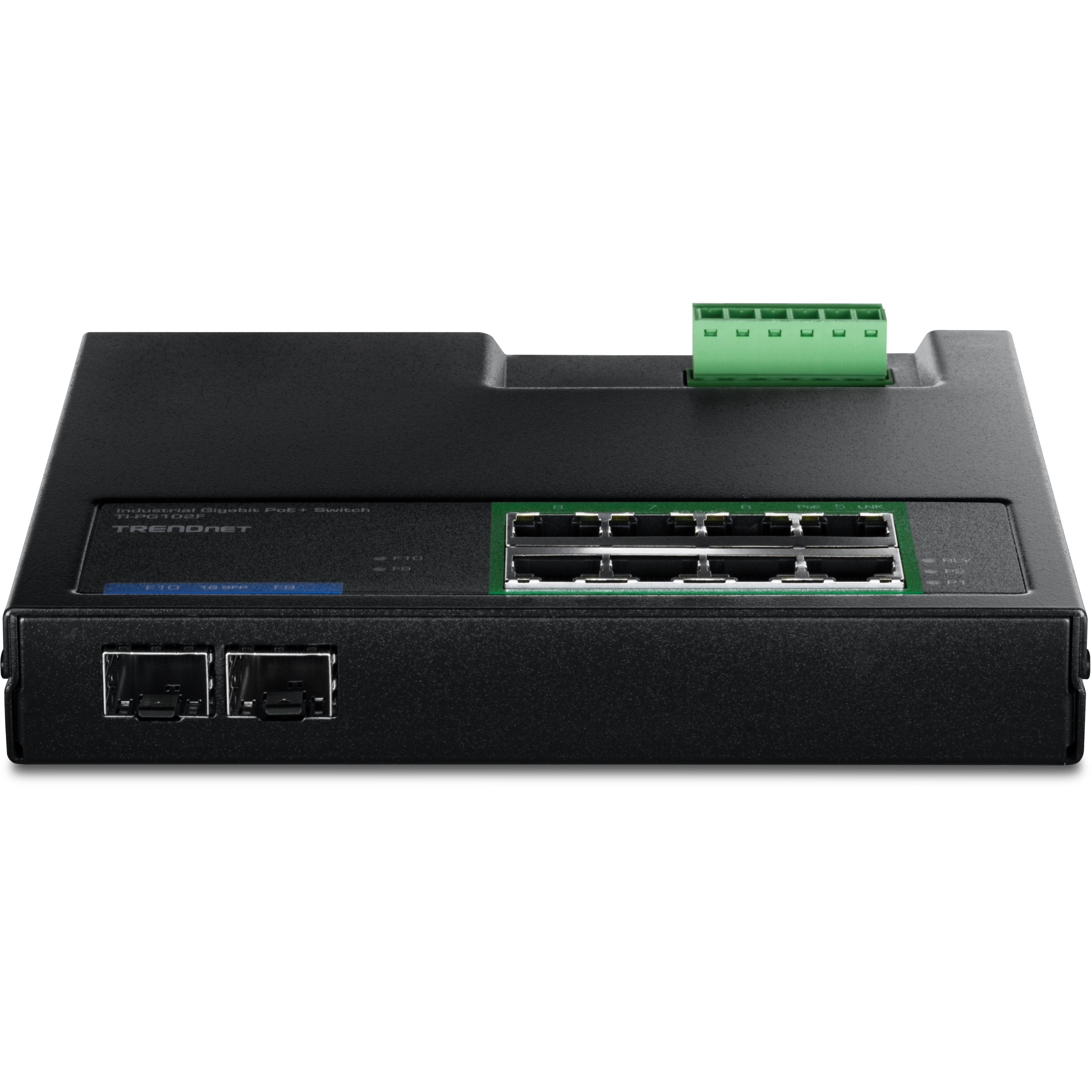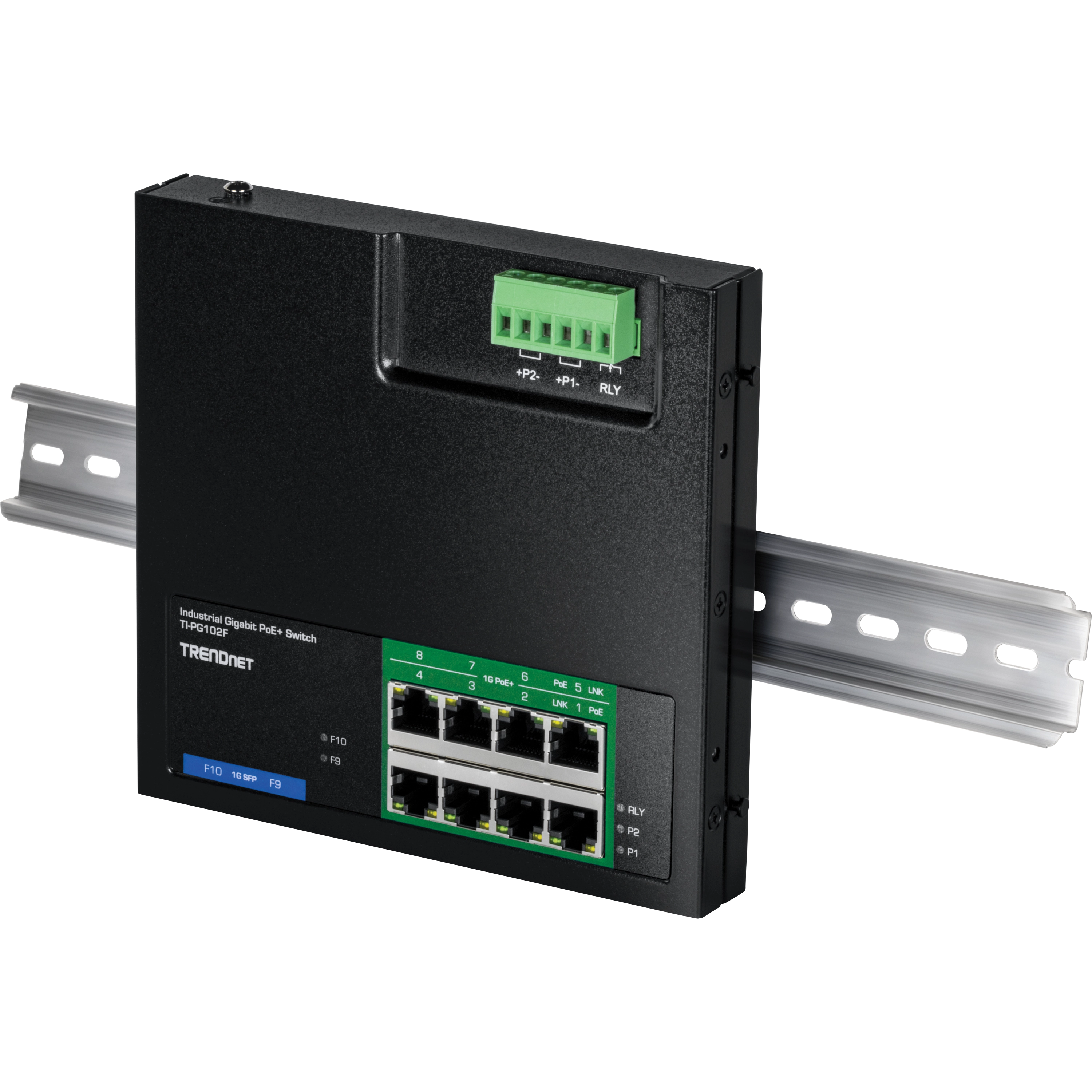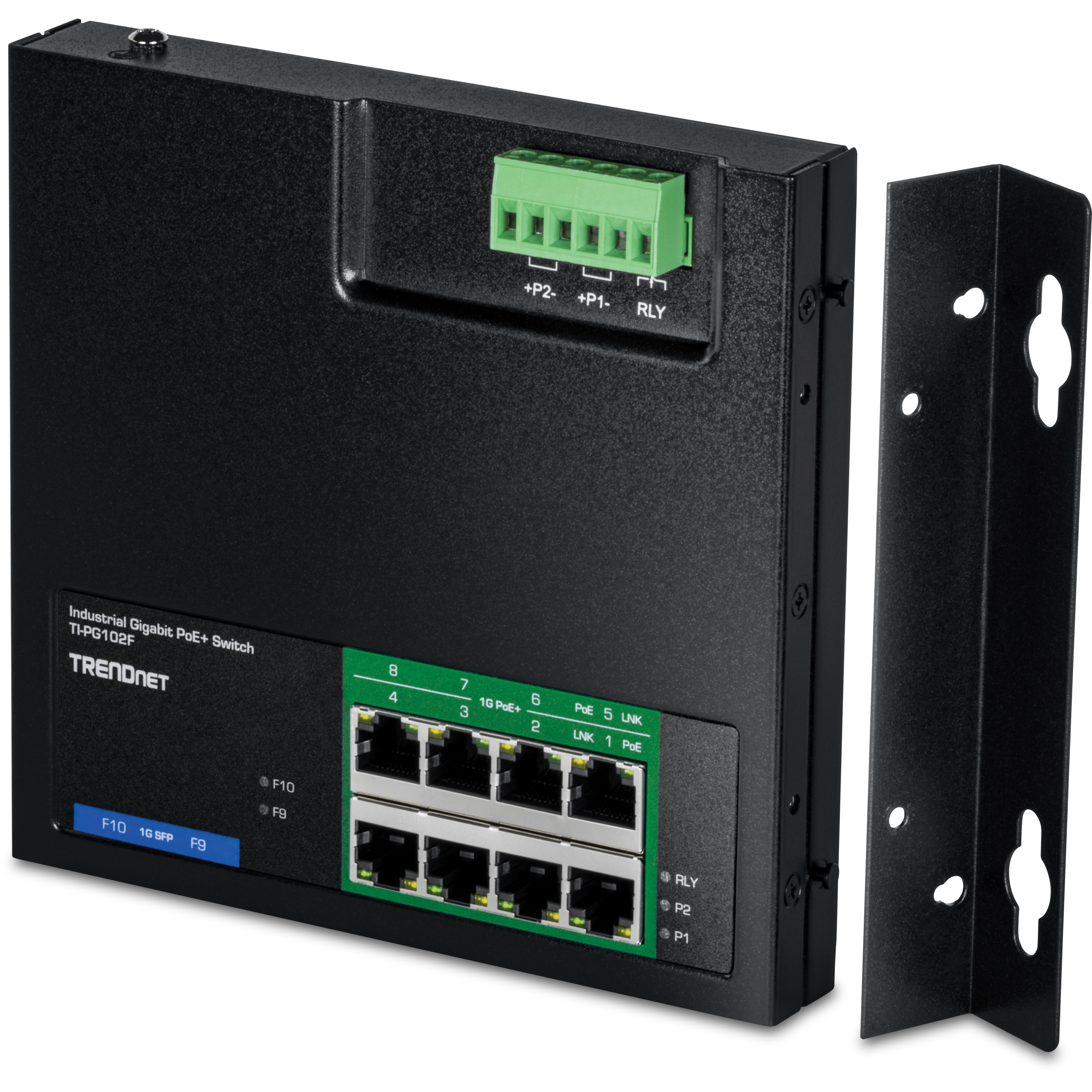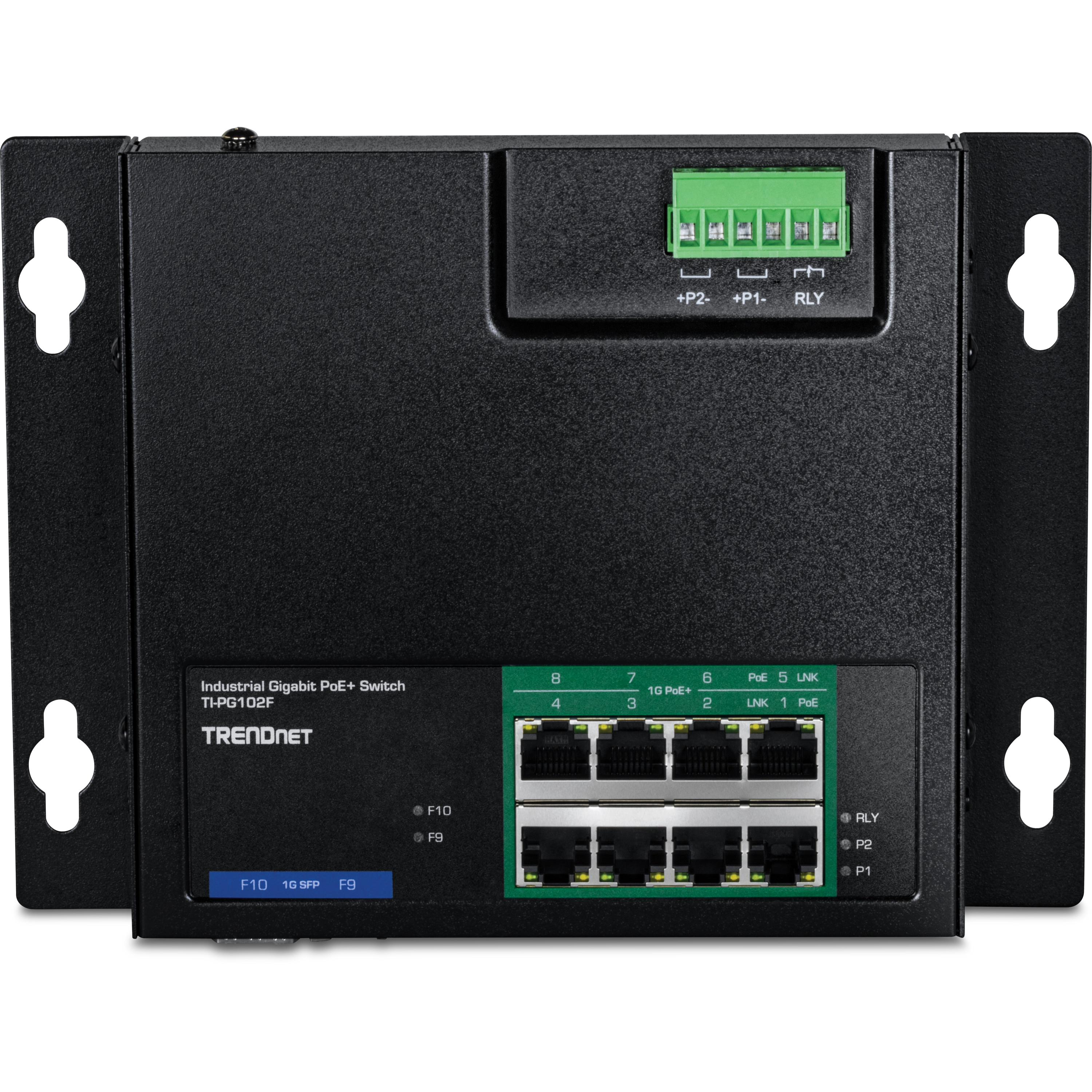 TRENDnet’s 10-Port Industrial Gigabit PoE+ Wall-Mounted Front Access Switch, model TI-PG102F, is well suited for IP surveillance, IoT, and automation networks for homes and businesses. This hardened industrial gigabit flat switch provides front access to ports and power interfaces for easier installation. The flat and compact size make it ideal for cabinet installations where space is limited. The 10-port industrial switch features eight gigabit PoE+ ports for connecting devices, such as wireless access points, IP cameras, and IoT appliances, and two SFP ports for long distance fiber network connections. This hardened front access switch comes equipped with an IP50 rated metal enclosure, designed to withstand a high degree of vibration and shock, while operating within a wide temperature range of -40° – 75° C (-40° – 167° F) for industrial environments.