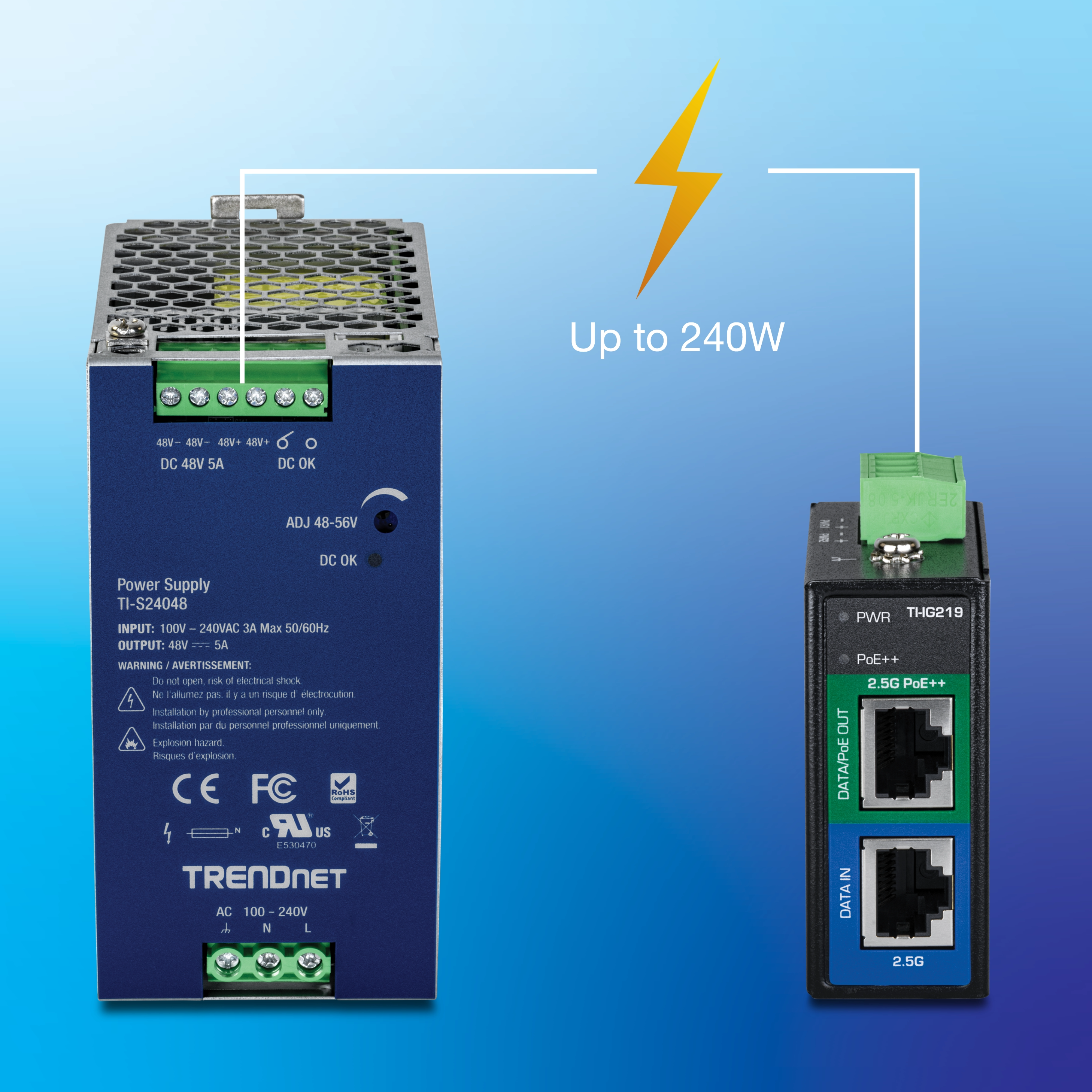 Provides up to 240W (48V DC, 5A) of power for networking devices, such as industrial switches, injectors, and extenders.