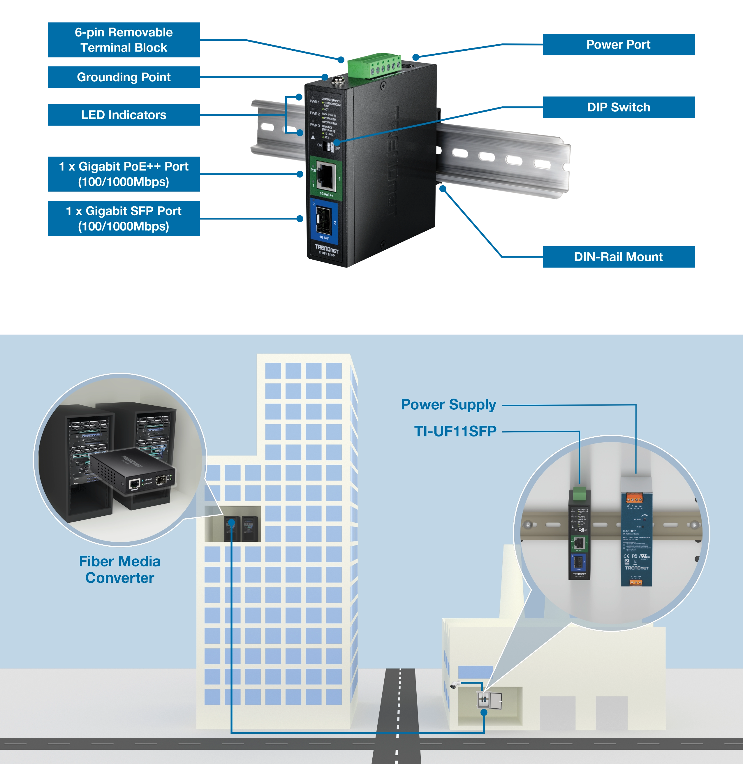 TRENDnet’s Industrial SFP to Gigabit PoE++ Media Converter (95W), model TI-UF11SFP, converts a long-distance fiber connection to a copper connection while providing power to PoE, PoE+, and PoE++ compliant devices, such as IP cameras, VoIP phones, and wireless access points. This PoE++ media converter is IP50 rated with hardened components for extreme industrial environments and an operating temperature range of -40°– 75° C (-40° – 167° F). The front panel DIP switches control Link Fault Pass Through (LFPT), and setting the device to switch/converter mode. The industrial PoE++ media converter’s rugged design also provides protection from shock, freefall, and vibration.