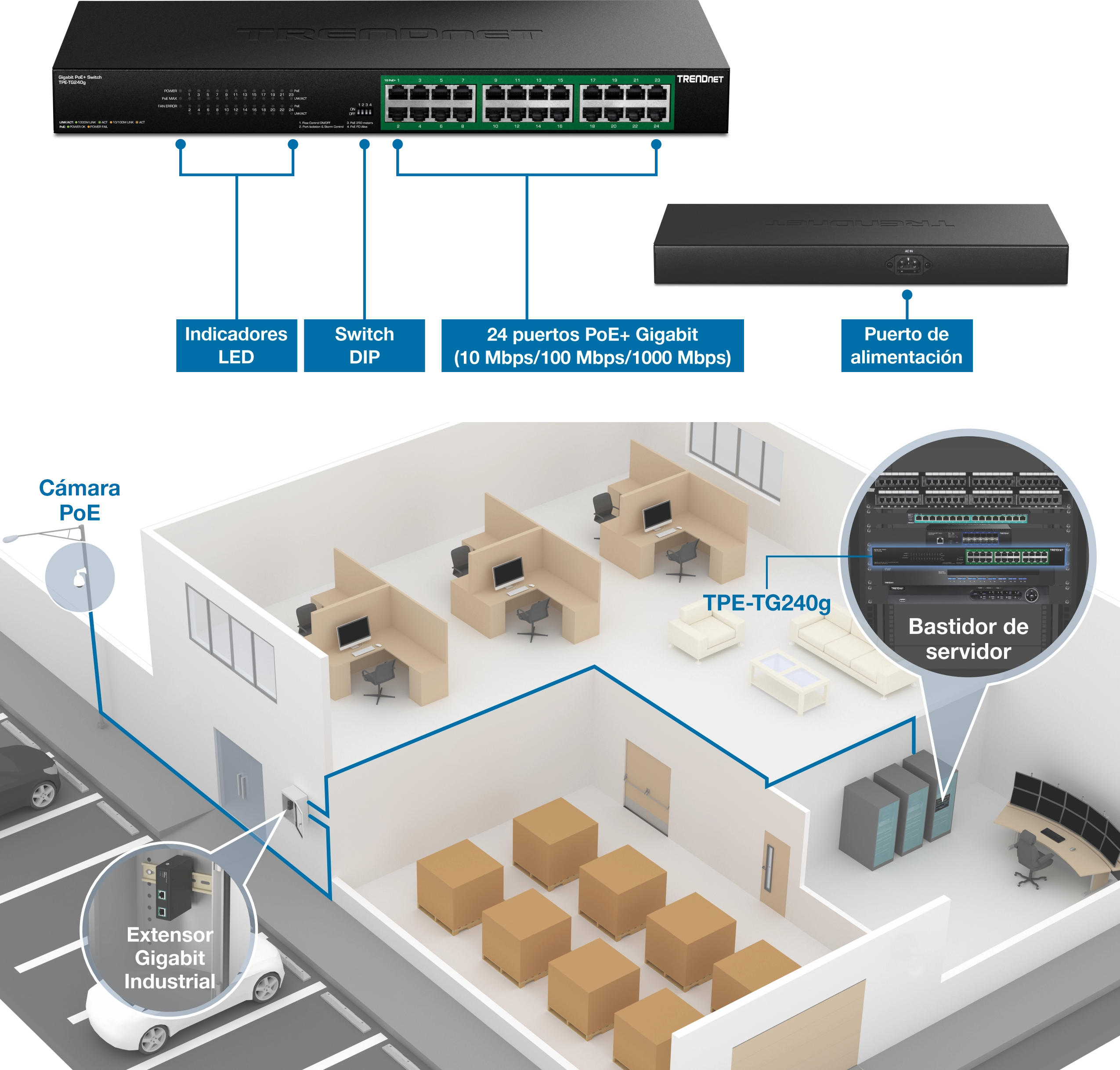 - Utilice este dispositivo compacto con switch o inyectores PoE