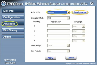 Click on the "Advanced" tab. Then on the authentication tab set it to "WPA-PSK" to encrypt. Next select the "Configuration" tab.