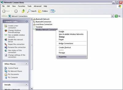 This will open the Network Connections window. Right click on your wireless network connection and click on properties.