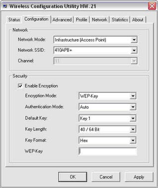 If you have encryption enabled on the network it will take you to the configuration tab. Enter your encryption values and click apply. It will then Switch you over to the Status tab.