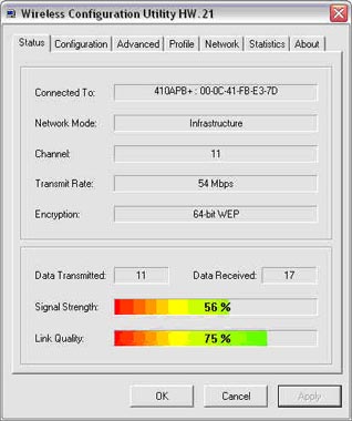 If you did not have encryption enabled it will Switch over to the Status tab. If the connection was successful you will receive status bars for Signal Strength and Link Quality.