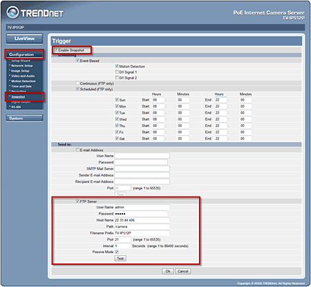 Once you have logged into the camera click on Configuration>Snapshot and place a check mark into "Enable Snapshot. Enter in your FTP server information and define your FTP event. You can choose either Continuous or Scheduled.