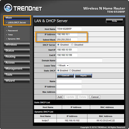 Local Area Network (LAN) IP address: 192.168.10.1, Subnet Mask: 255.255.255.0