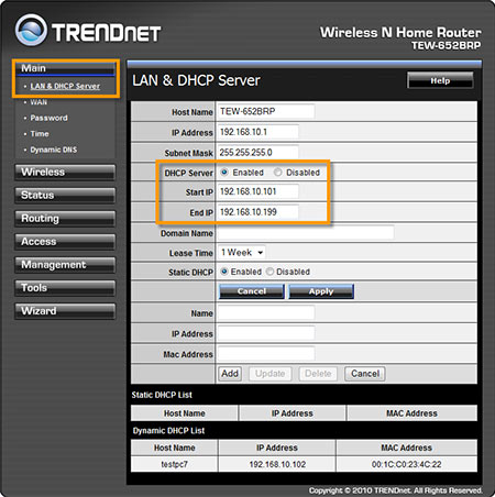 This means the DHCP address pool is 192.168.10.101 ~ 192.168.10.199.If a network computer or a network device that is connected to the Router and setup to automatically receive an IP address, it would receive an IP address between 192.168.10.101 ~ 192.168.10.199 from the Router.