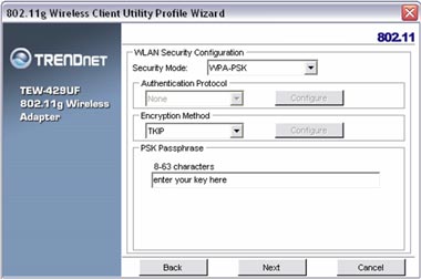 For WPA encryption the Security Mode is set to WPA-PSK, enter your key into the PSK Passphrase field. Click Next.