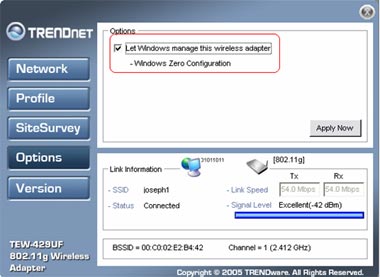 Step 2 Click on the Options and uncheck Let Windows manage this wireless adapter. Then click Apply Now.
