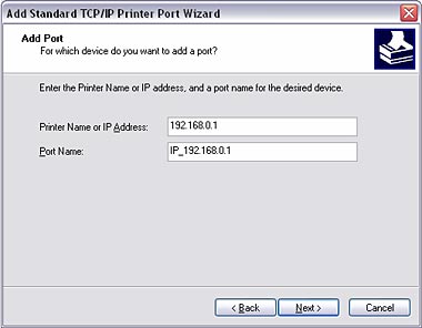 Step 4 Enter the IP address of the Print Server (192.168.0.1). Leave the port name with the default name. Click Next.