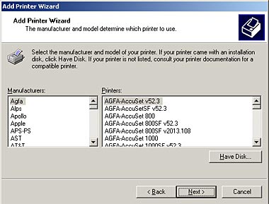 Step 10 Continue with the Add Printer Wizard. Choose your printer from the list or click Have Disk and point to your printer driver disk.