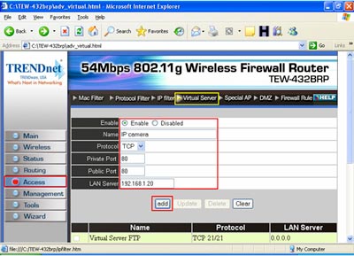 Step 9 Now click on "Enable", fill in the Name, next, you will use TCP for the Protocol, input Port 80 for both the Private and Public port, and the IP address of the Camera (in this case, we used 192.168.1.30) and then click "Add".