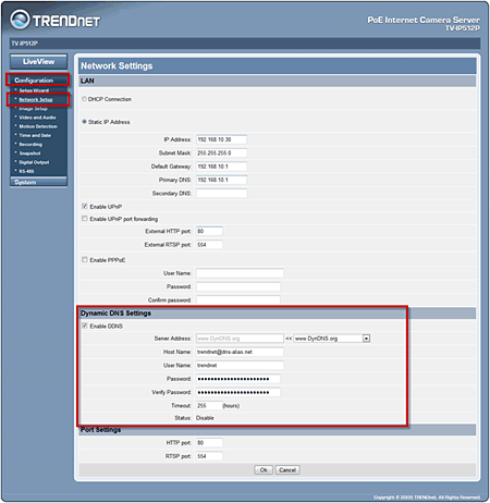 Click on Configuration>Network Setup. Enter in the Dynamic DNS settings.