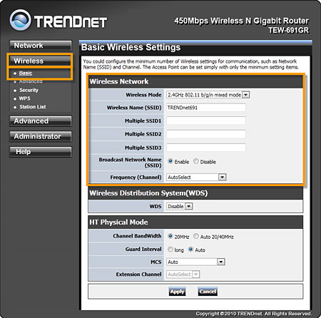 Click Wireless and then Basic. You can define the wireless network parameters here.